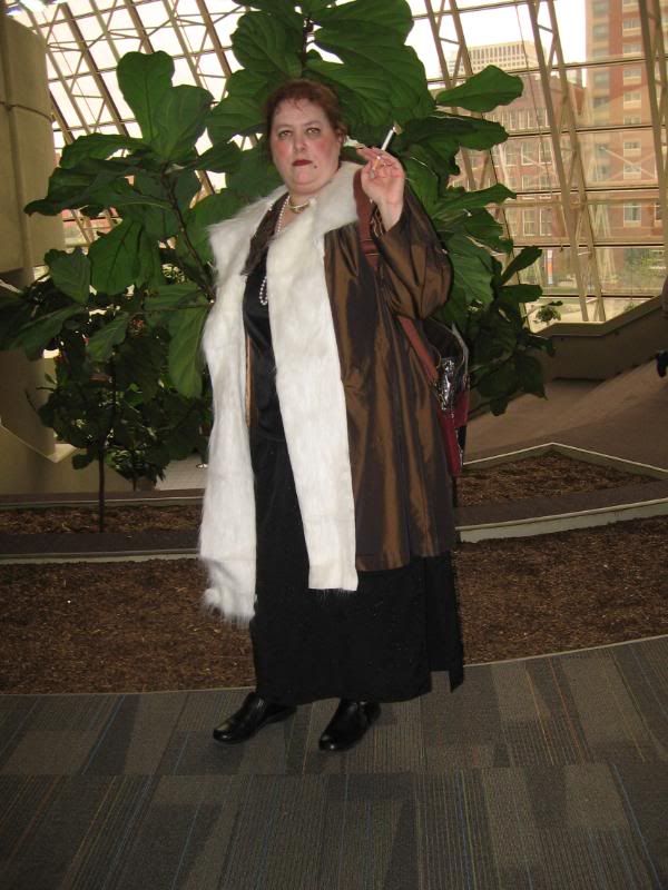 Oddly enough the hose behaved until we stopped for lunch at Wendy’s on the way up then they started rolling a little as I feared. I figured I’d spend the con hiking up my waistband but they rolled all the way down and started ripping in the crotch, just too short. I ended up taking them off before we even got into the con. The registrar girls loved the coat so yay.