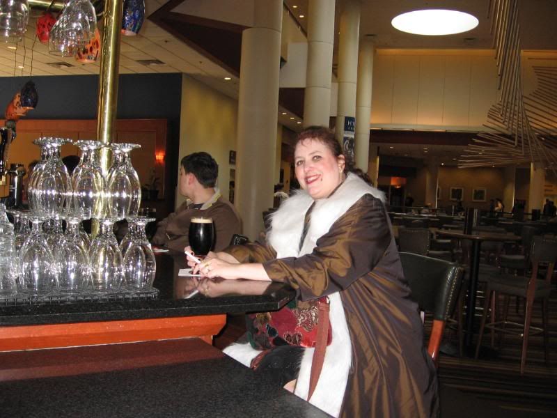 While I was resting up and we were deciding did we want to kill an hour so we could find one lecture we might have wanted to hear, I saw the Hyatt’s bar was right outside the con entrance. Where better to cosplay Chris? They had Guinness on tap and that made the cute young man we sat next to take notice. Oooo, you’re going to drink that? He talked to us for an hour. He was there for the con. After that we decided we really didn’t want to hear any of the speakers and just headed out to shop in the real world and go for dinner.