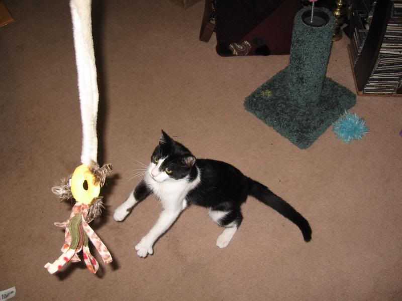 big lots had a cat toy for 2$ since Kanda broke his wal-mart one (points up). It's a mouse on a fishing reel that I can whip around. I wasn't paying attention. It makes MOUSE sounds. So either I'm warning every mouse in 500 yard that painful death awaits or I'm setting out a mating cry