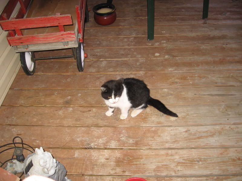 And there's been a break through. Today unnamed spooky kitten who would freak if he touched me let alone me trying to touch him, came over with Roy (who is now back). I pet Roy and kitten didn't cringe. I tried to pet kitten. He just looked at me as if to say 'what the HELL are you doing to me?' but he didn't flee. In fact he thrust his head into my hands. PET ME! OMG scratch me there. I got a toy and we played for about a half hour. I'm calling him Kanda. He tried to gnaw off my bare big toe