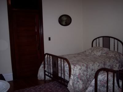 We go to meet Jay the Harley riding florist landlord (Um talk about the mixed signals). Jay’s cute, didn’t even mind the potbelly. Jay’s very nice. He bought this house with all the furniture in it and I can have it all if I want it. The house is circa 1900-1910. It has a big front porch and a little grass but it’s right on the road otherwise. The living room is nice with a fireplace. The main bedroom has a window onto the porch and one looking at the florist shop parking lot. It needs to be said that the windows are ancient and about 6 feet high. This bedroom only has a narrow closet (from a time when wardrobes were used only) and opens into the other bedroom which overlooks the dumpster. Gack. This bedroom opens into the bathroom (all the bedrooms are furnished at this point) Claw foot tub…no shower and a toilet that’s falling in and a sink that’s probably original. Seriously, he should have spent a few bucks (yes he did huge amounts of labor taking up ancient rugs and wallpaper and opening painted shut windows but damn, spend a few hundred and replace a sink that nauseates people looking at it).