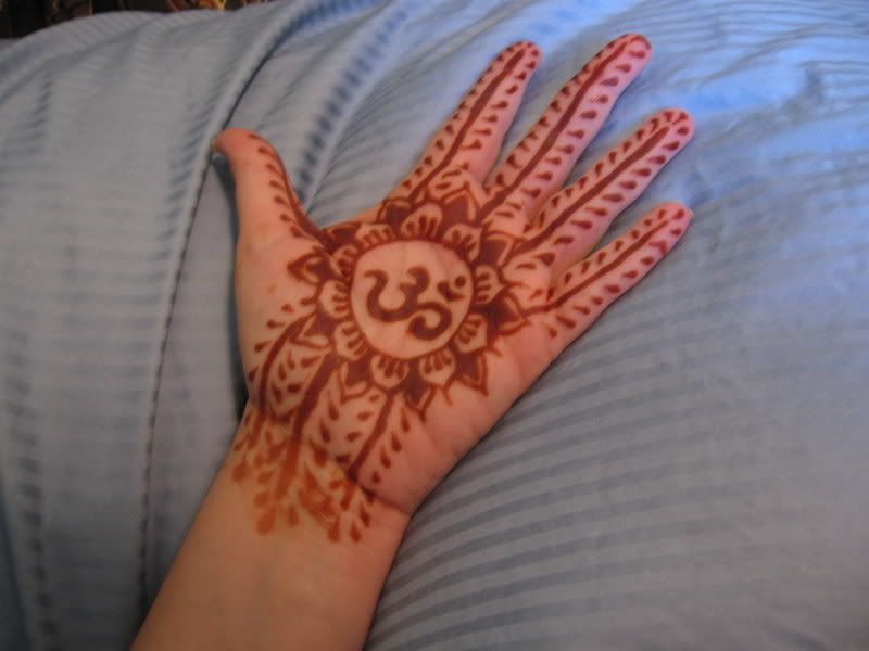 firstly the hand which was a smash hit with students and faculty a like lotus flower henna tatt with ohm symbol Note the blue sheets are the 300$ 600 thread count sheets i got at Macy's on their bedroom bonzana sale for 50$.