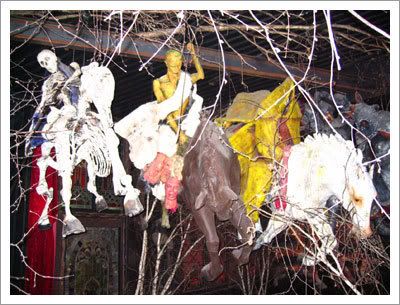 Diane pointed up. Everyone looked. On the walls, row after row of wooden horses ran forever in line. Hanging from the ceiling, the four horsemen of the apocalypse rode on frozen in time, something none of them really wanted to be reminded of, and mannequins done up as angels flew in spirals like a fantasy version of a Calder mobile. Giles had never seen anything so surreal, not even back in his misspent youth dropping acid with Ethan.