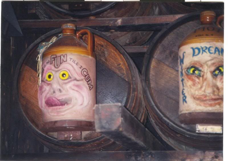 Further down the corridors, he came across a collection of alcohol barrels, many with faces on their end cap. The one closest to him was leering with its tongue stuck out and white stuff dripping down the side of its face. This particular demon rum container claimed ‘ it’s no fun until I cum .’